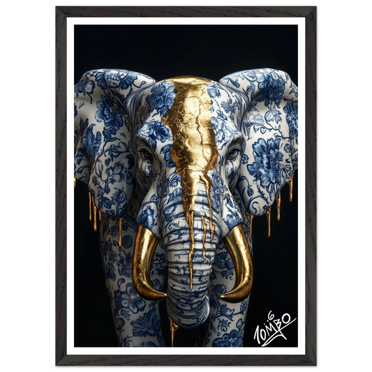 Elephant With Floral Design and Gold Drip Art Print With Oak Wood Frame