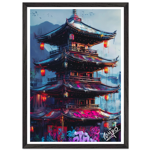 Japanese Framed Street Art Print With Oak Wood Frame - Urban Pagoda Z - Urban Graffiti Home Decor
