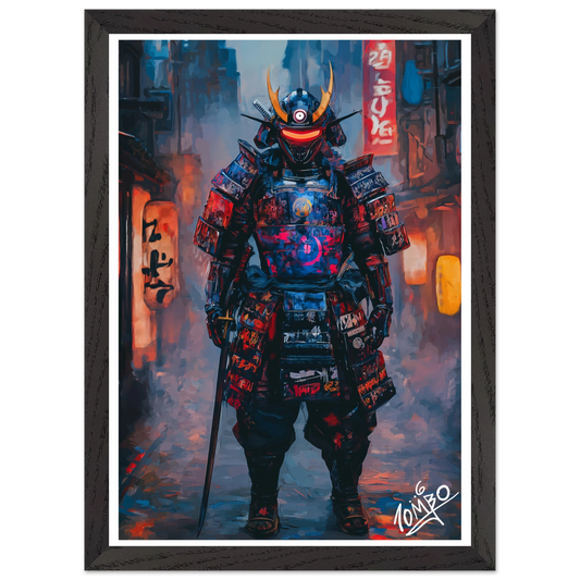 Japanese Street Art Print With Oak Wood Frame - The X Samurai - Urban Graffiti Home Decor