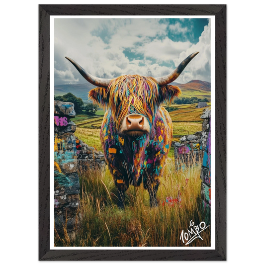 Highland Cow Street Art Print With Oak Wood Frame - Colour in the Countryside