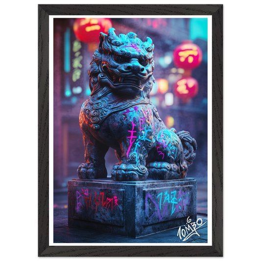 Japanese Framed Street Art Print With Oak Wood Frame - Foo Dog V - Urban Graffiti Home Decor