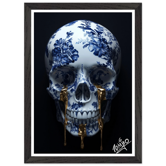 Skull With Floral Design and Gold Drip Art Print With Oak Wood Frame